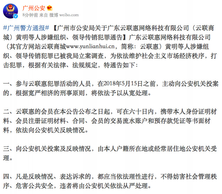 上午10点广州公安发出四项通告: 参与云联惠犯罪活动的人员,在2018年5月15日之前,主动向公安机关投案的,根据宽严相济的刑事原则,将依法予以从宽处理; 云联惠的会员在本公告公布之日起,可在六十日内,携带本人身份证明材料、会员注册证明材料、合同、会员的交易流水账户和预存款凭证等书面材料,依法向公安机关反映情况; 向公安机关投案及反映情况,由本人户籍所在地或经常居住地公安机关受理; 凡是反映情况、表达诉求的,都应当依法理性进行,不得妨害社会管理秩序、危害公共安全,违者将由公安机关依法从严处理。